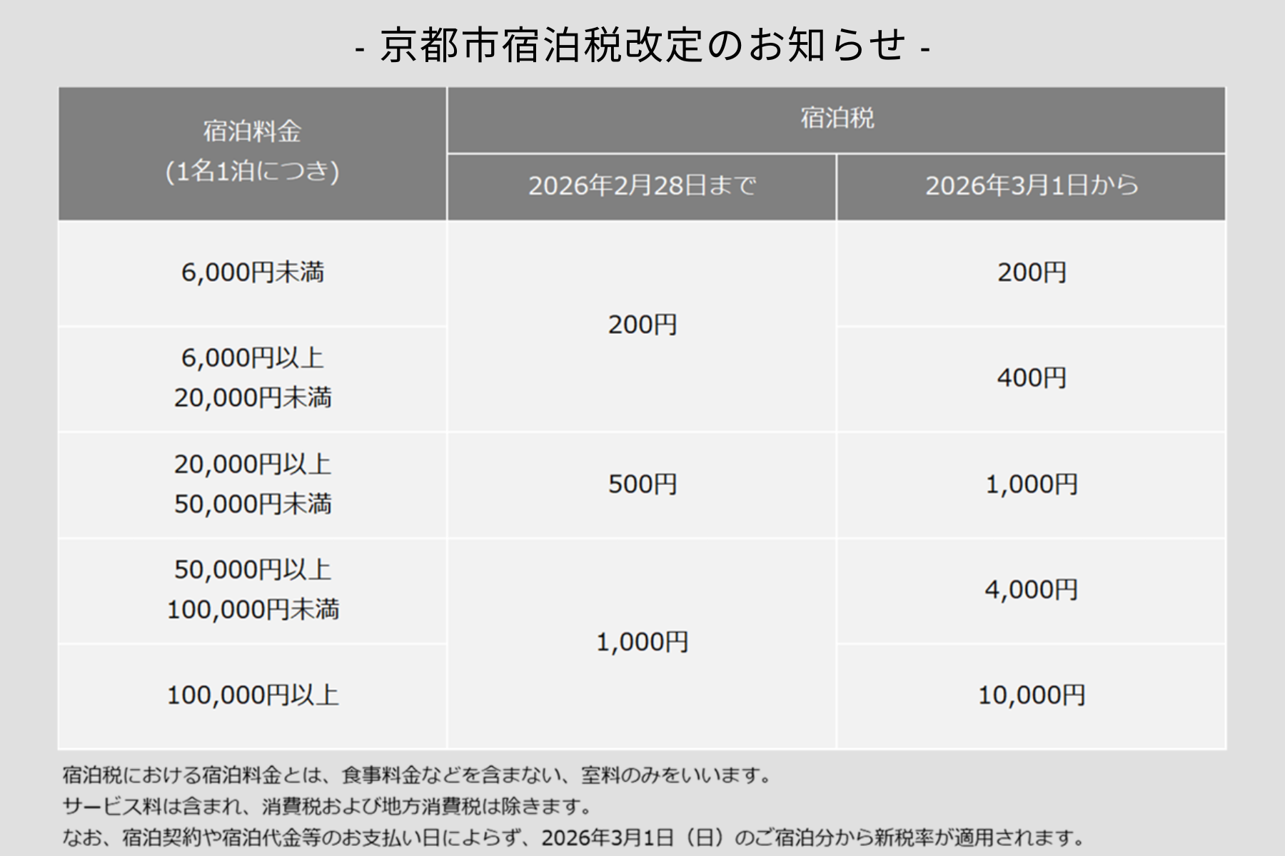 京都市では、2026年3月1日(日)より宿泊税額が改定されます。